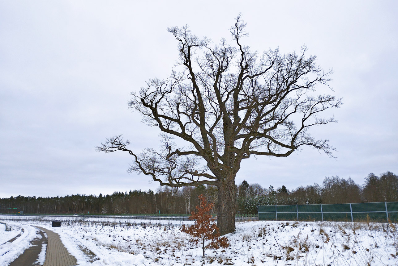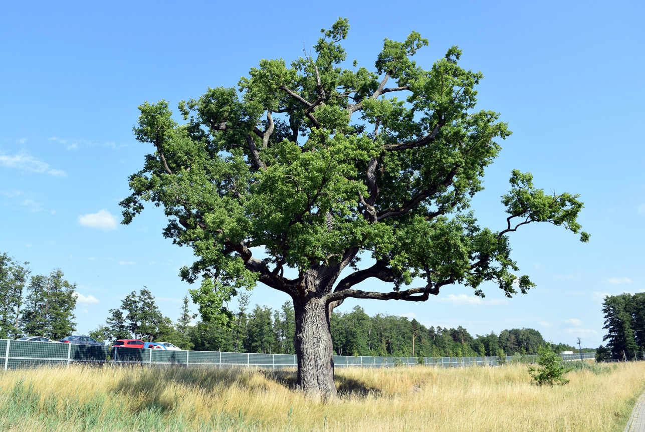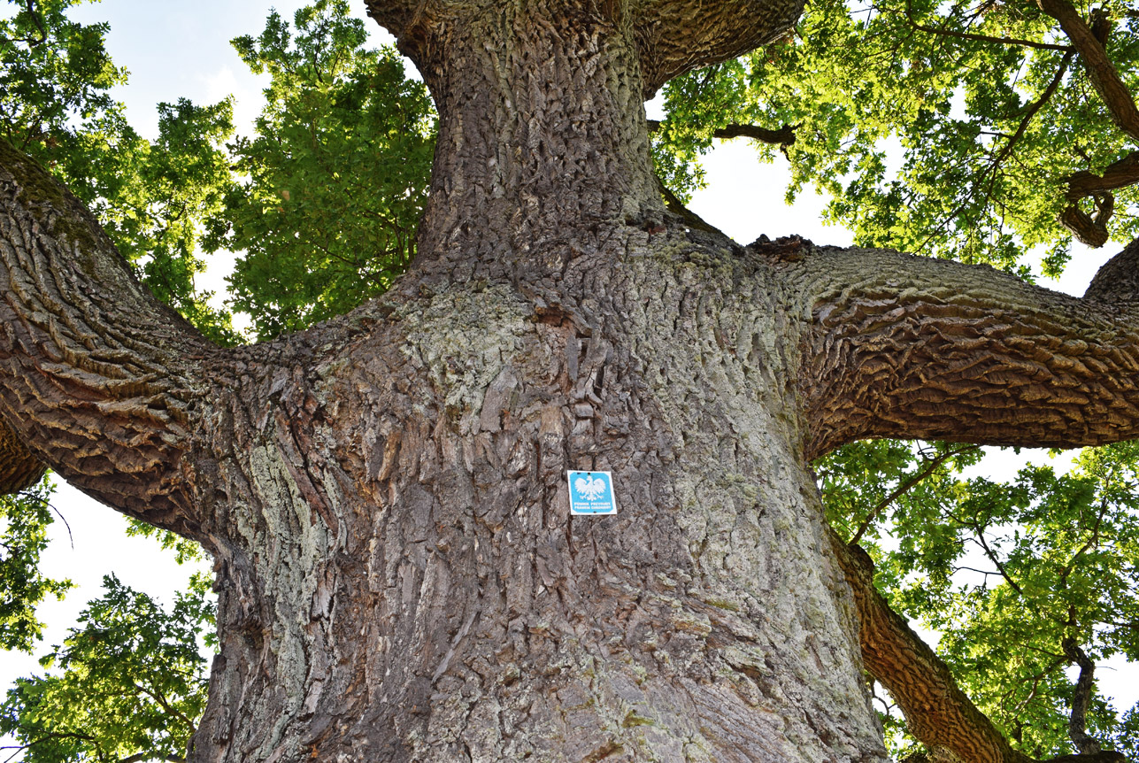 dąb szypułkowy, wiek 200-220 lat, wys. 33 m, obwód 502 cm, pomnik przyrody.