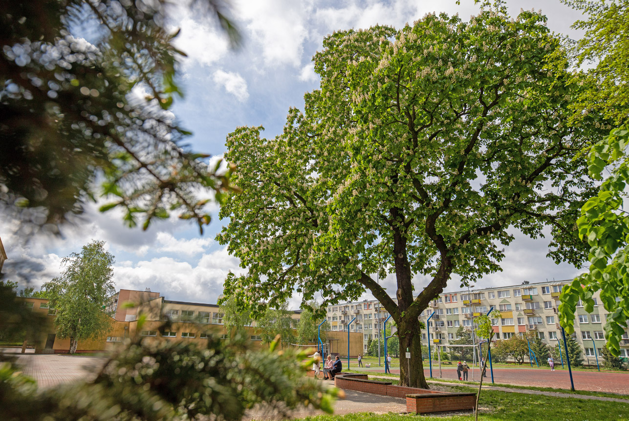 kasztanowiec zwyczajny, wiek 150 lat, wys. 16 m, obwód 331 cm, pomnik przyrody.