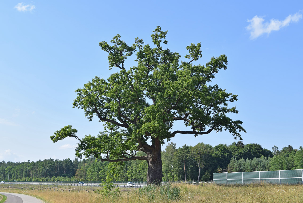 dąb szypułkowy, wiek 200-220 lat, wys. 33 m, obwód 502 cm, pomnik przyrody.